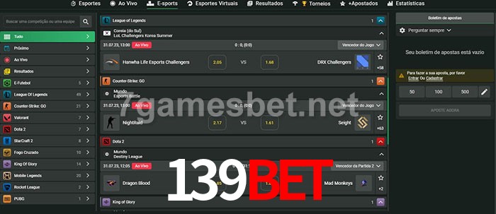 O 139Bet oferece uma grande seleção de opções de apostas em e-sports com probabilidades competitivas